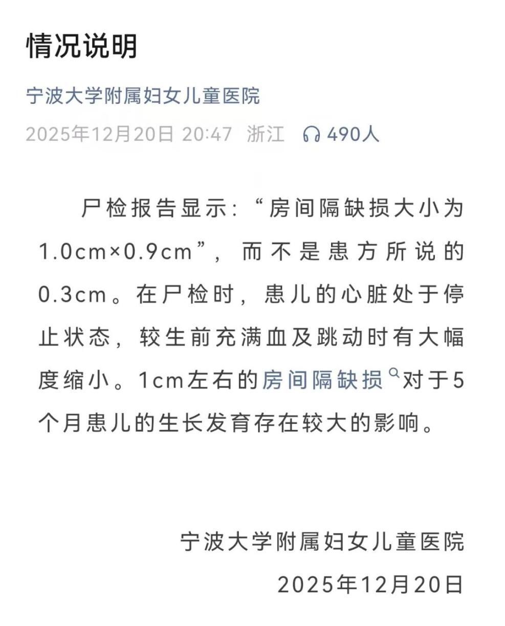对于房间隔缺损大小问题,宁波大学附属妇女儿童医院日进行了回应。医院方在微信公众号中称,尸检报告显示:“房间隔缺损大小𰹅.0cm×0.9cm”,而不是患方所说.3cm。在尸检时,患儿的心脏处于停止状态,较生前充满血及跳动时有大幅度缩小。1cm左右的房间隔缺损对𱆑个月患儿的生长发育存在较大的影响。